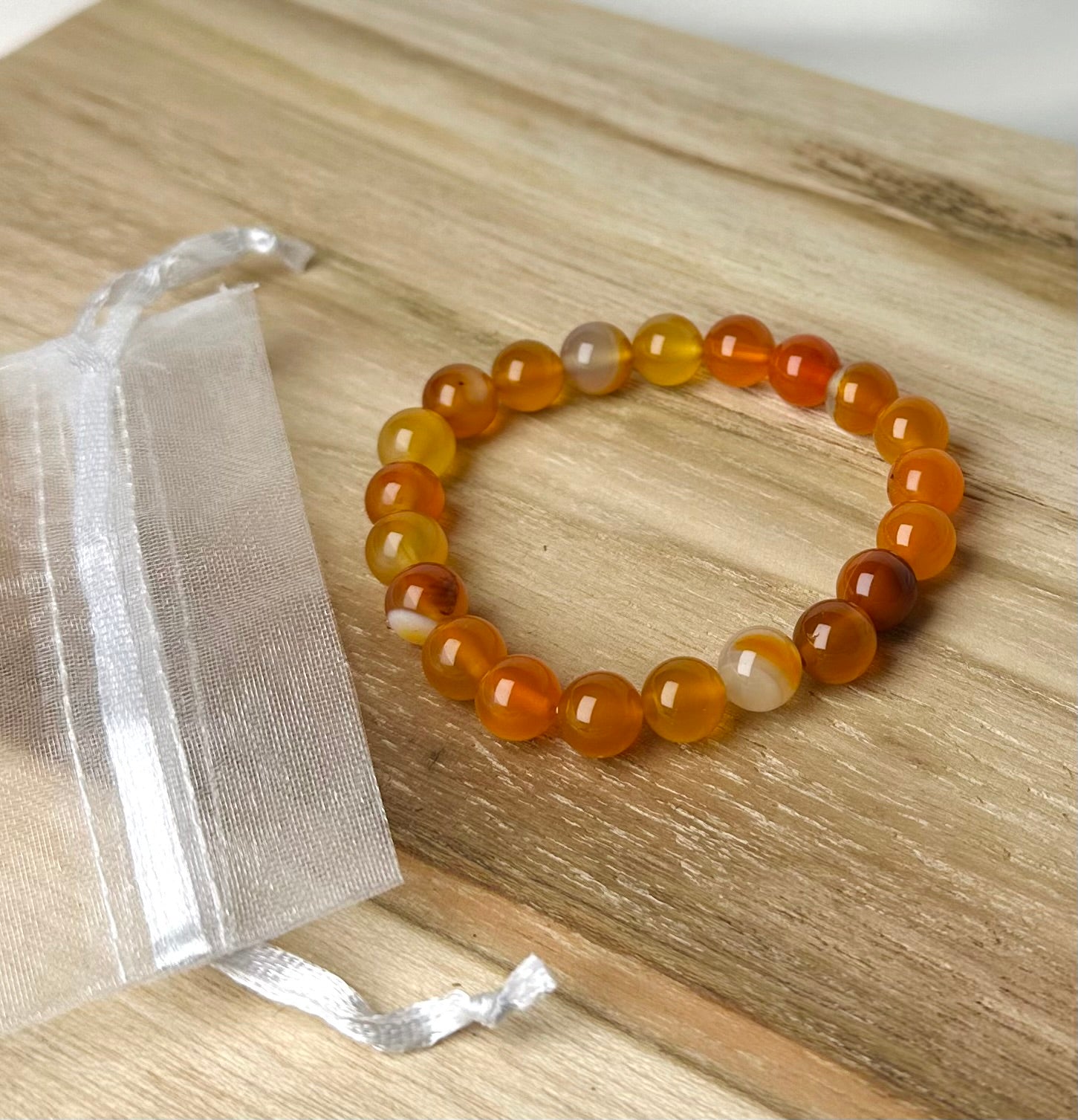 Carneool is een levendige, oranje-rode edelsteen die bekend staat om zijn vitaliserende en motiverende energie. Het stimuleert creativiteit, verhoogt het zelfvertrouwen en helpt bij het overwinnen van angst en onzekerheid.