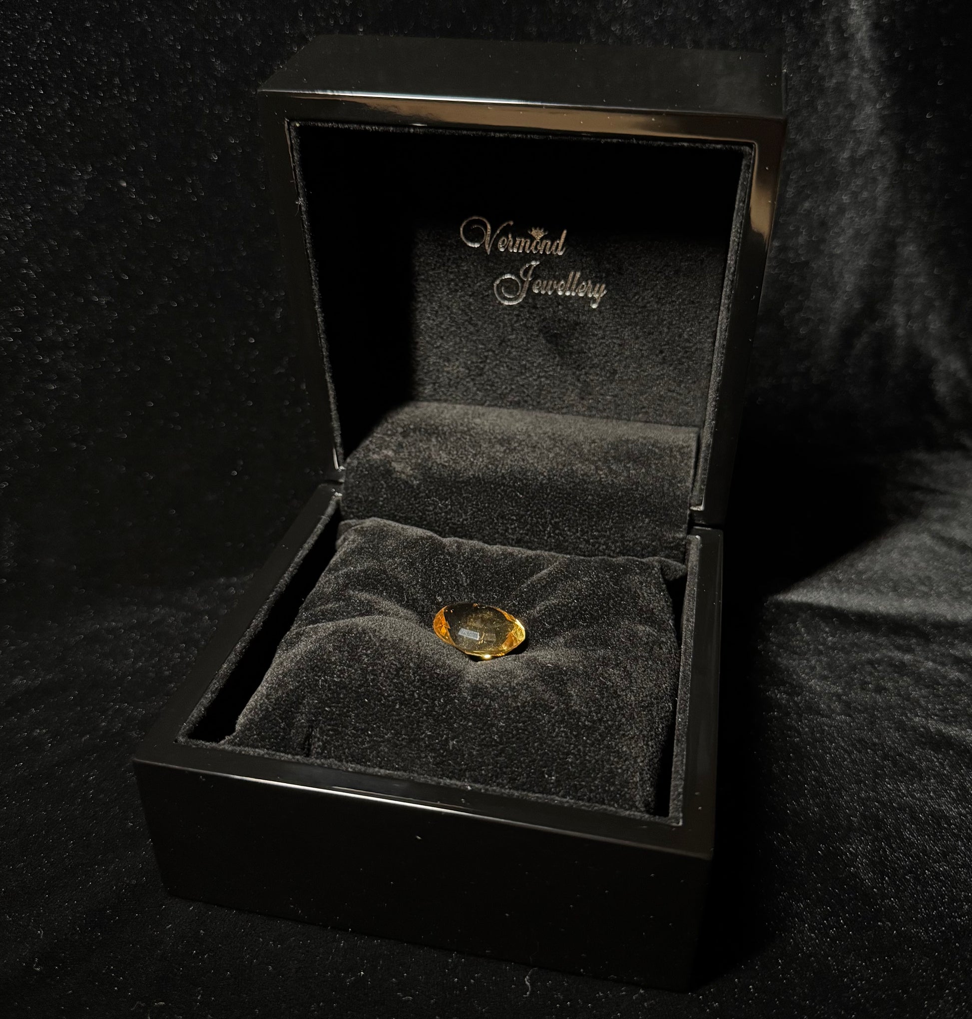 Deze prachtige geslepen Citrien van 21,50 CT komt in een zwart glanzende houten box. De edelsteen ligt in een fluwelen kussentje.