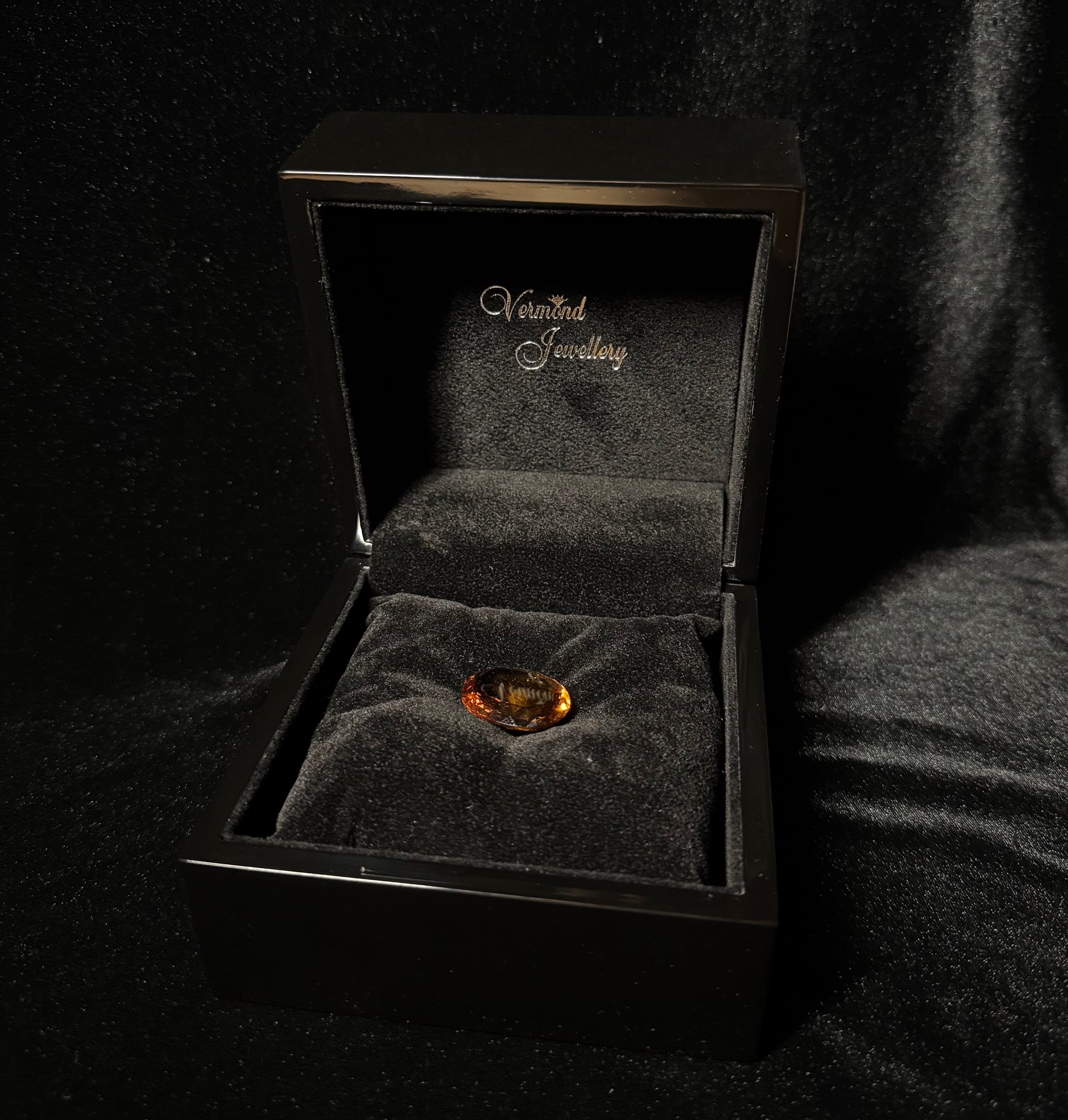 Deze prachtige geslepen Citrien van 29,74 CT komt in een zwart glanzende houten box. De edelsteen ligt in een fluwelen kussentje.