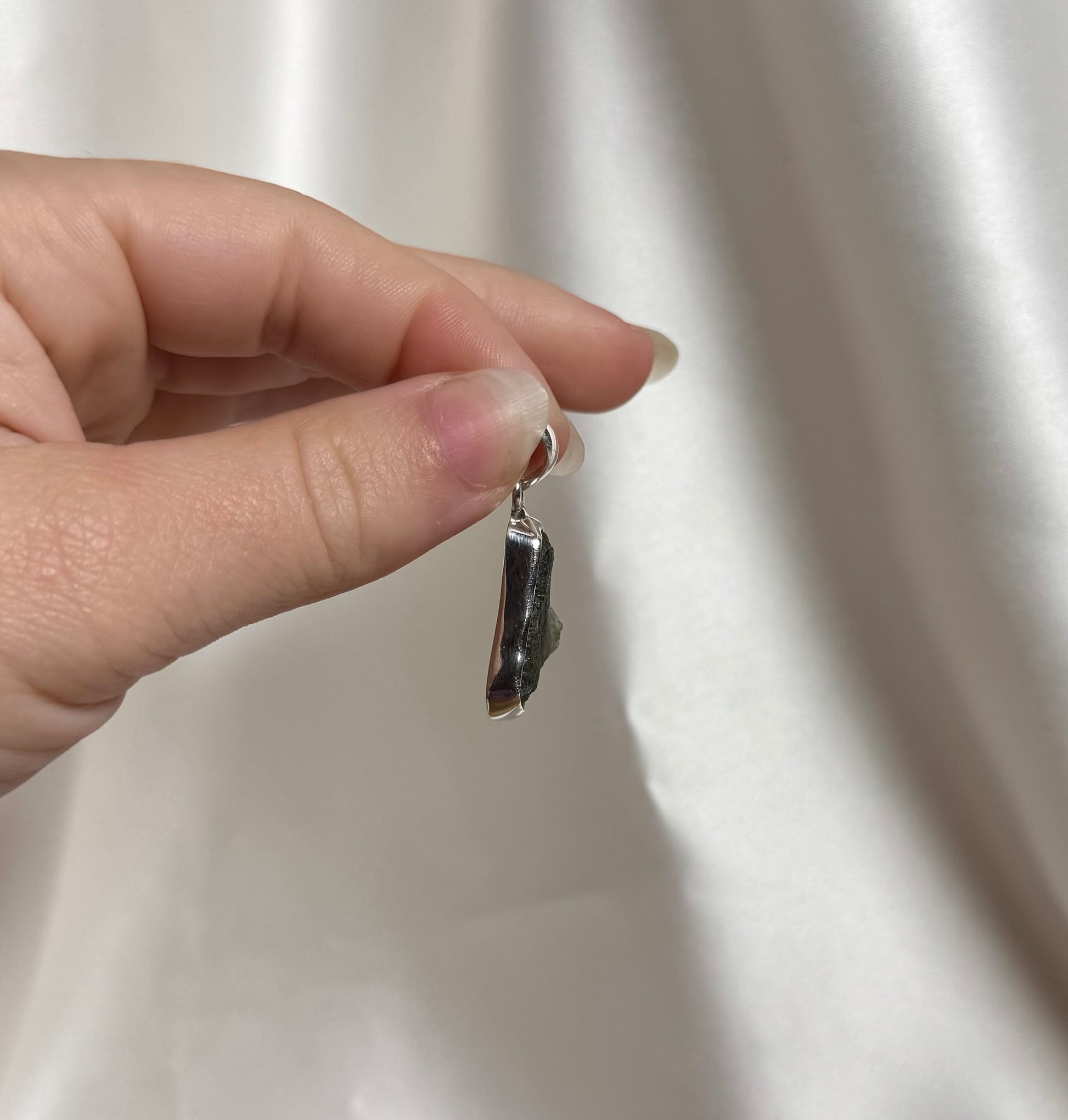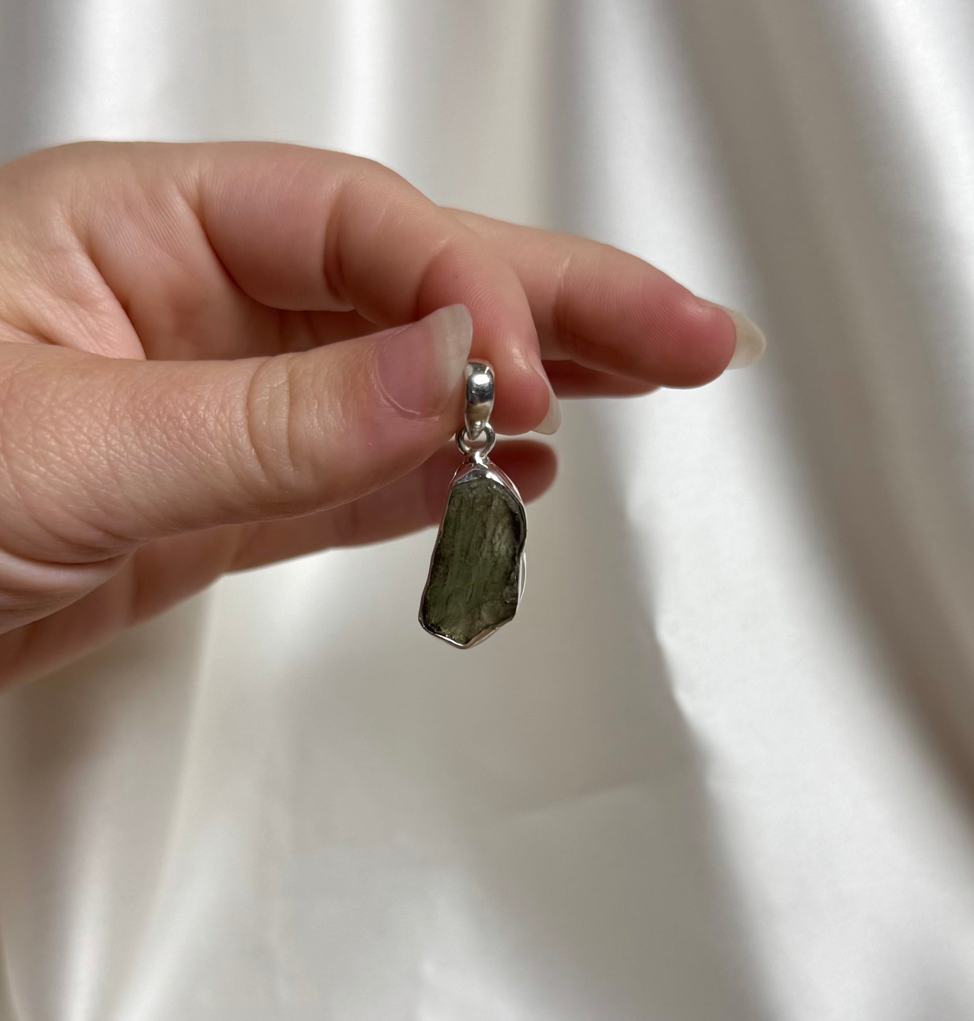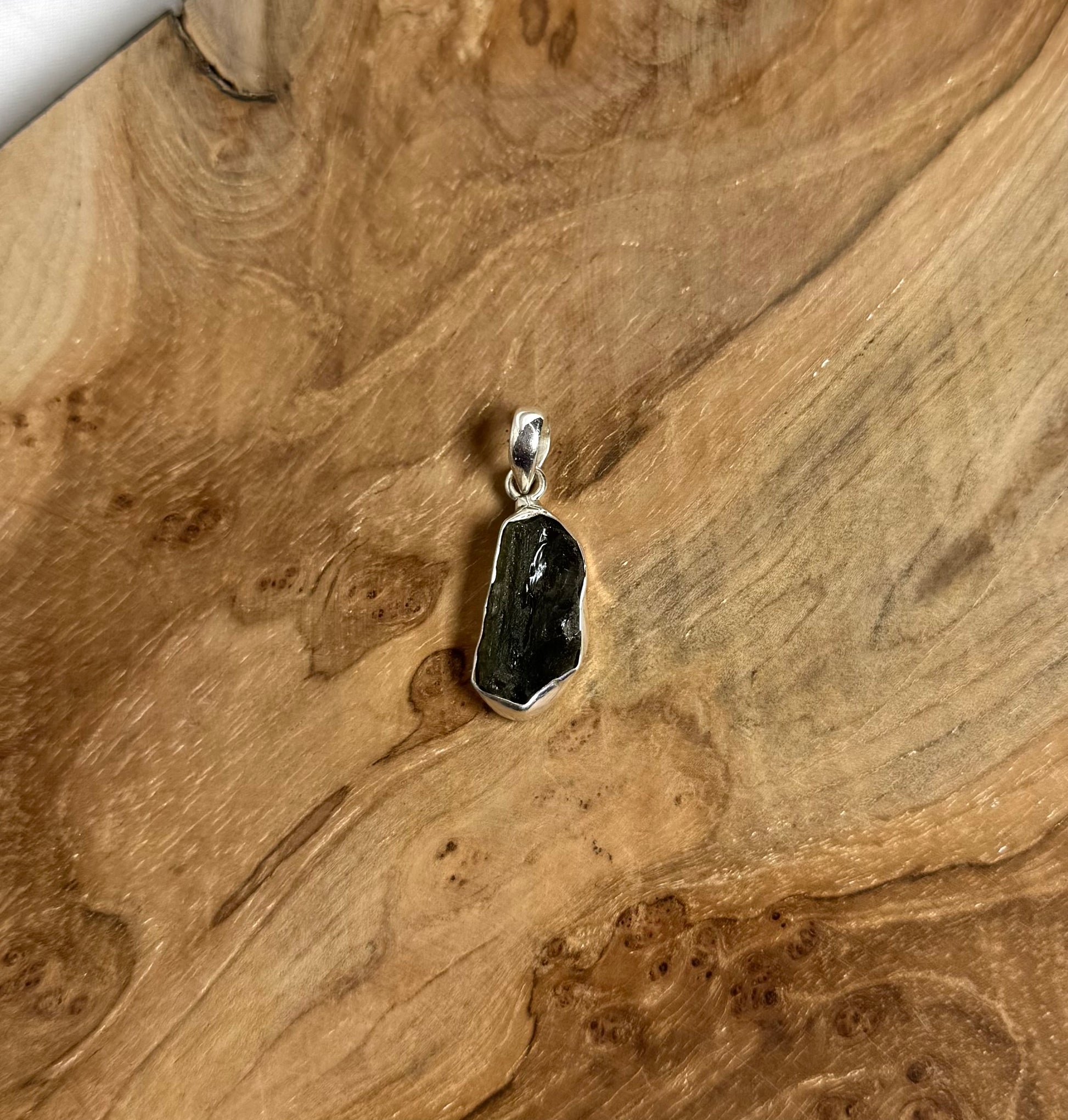 De steen is gezet in 925 Sterling zilver. Het zilver vormt een elegante omlijsting die de natuurlijke schoonheid van de Moldaviet benadrukt.